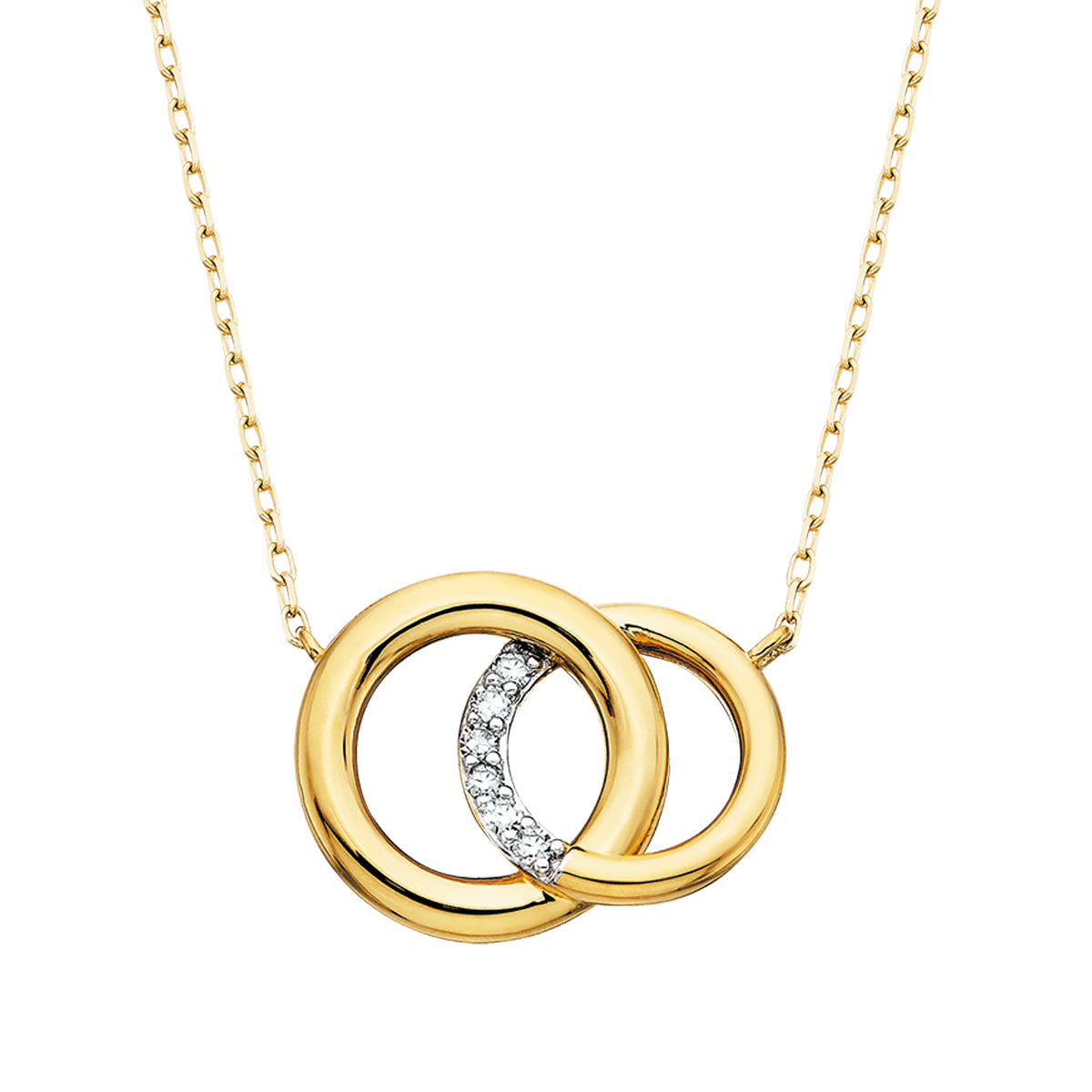 Celebrate enduring connections with this necklace, crafted in sterling silver and kissed with yellow gold vermeil. This trendy vermeil necklace showcases a stunning design with two interlocking circles– symbolizing unbreakable bonds– elegantly embellished with shimmering white sapphires. Utterly stylish, this necklace is a timeless, elegant symbol of meaningful connections. Don't forget to complete the look with matching studs for a perfectly coordinated statement!