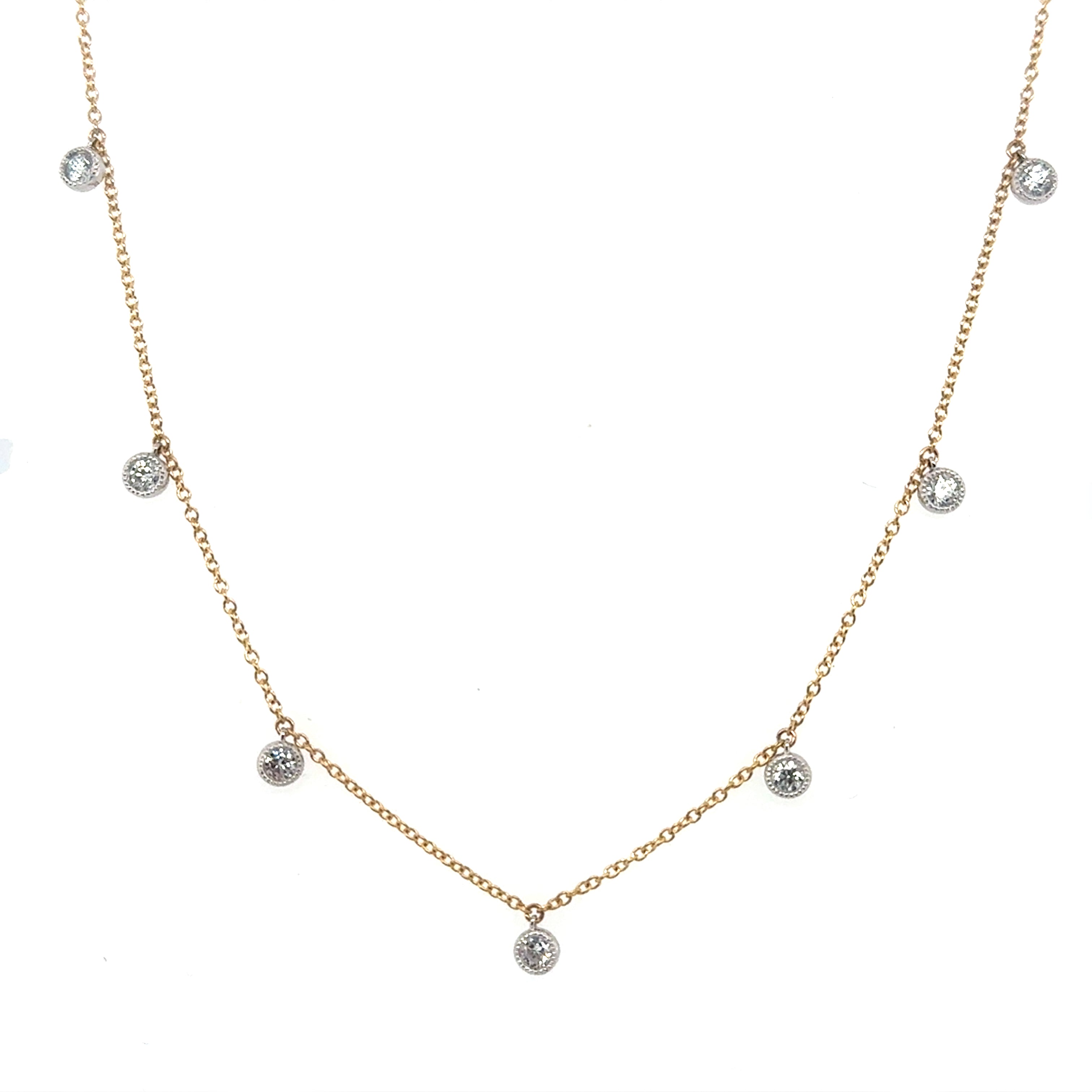 This darling station necklace features seven lab-grown diamonds, each gently swaying with your every movement. The bezel settings are adorned with milgrain detailing, infusing vintage-inspired charm. The diamonds dance evenly spaced along an 18-inch yellow gold chain, adjustable down to 17 or 16 inches, so it graces the neckline at whichever length suits your mood! An exquisite necklace that's perfect for your special day—or any day that deserves a touch of luxury!