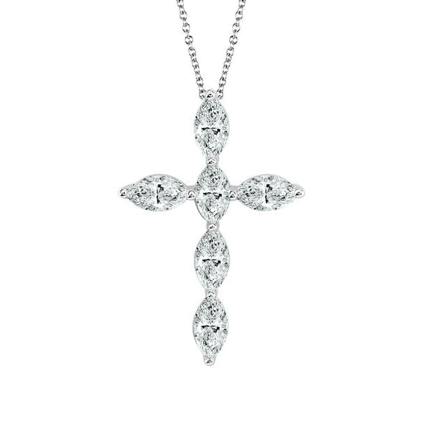 A timeless symbol of faith, reimagined with modern brilliance. This striking cross pendant features marquise diamonds arranged in perfect harmony, each secured in single prongs that lend a refined, contemporary edge. Complete with an adjustable cable chain, this pendant offers versatility and meaning—an enduring expression of both faith and style.