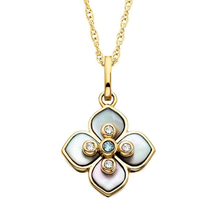 Four luminous mother-of-pearl petals unfold to reveal a stunning flower of blue and white topaz. Crafted in sterling silver and coated in 18K yellow gold vermeil, this pendant effortlessly blends romantic style with timeless elegance. The adjustable chain lets you choose the perfect fit for any ensemble, offering a length anywhere between 18 and 20 inches. Try pairing with the matching earrings for a perfectly coordinated look!