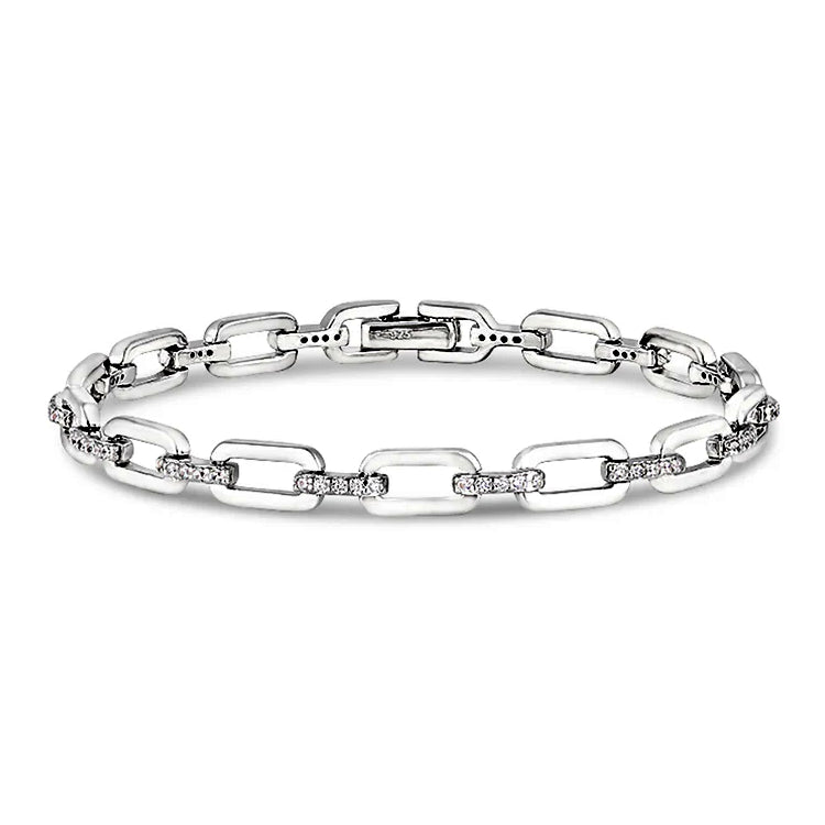 Bold links, subtle sparkle. This open link bracelet is crafted in platinum-bonded sterling silver, with sleek, high-polish links joined by connectors accented with cubic zirconia. The design gives just the right touch of shimmer while keeping its modern, versatile edge. A statement on its own or stacked with your other favorites, it’s the perfect blend of contemporary style and everyday wearability.
