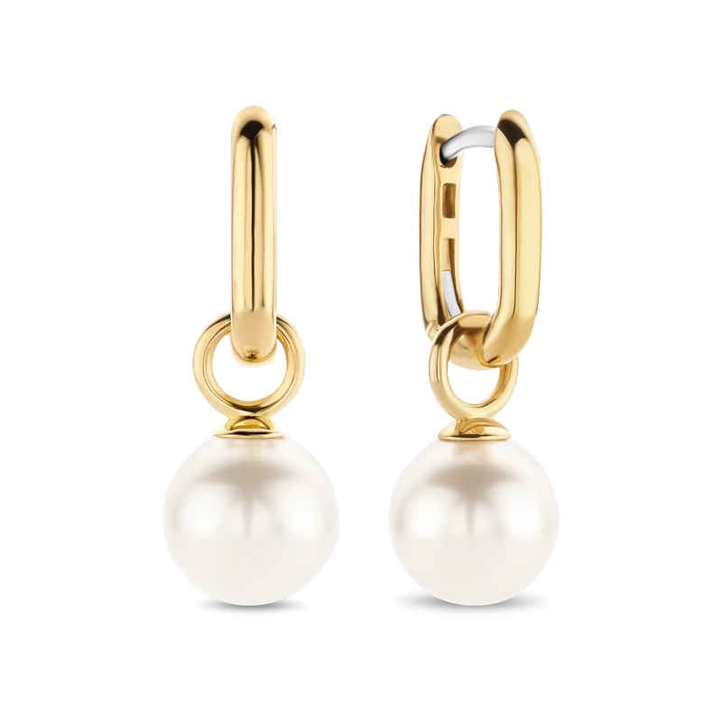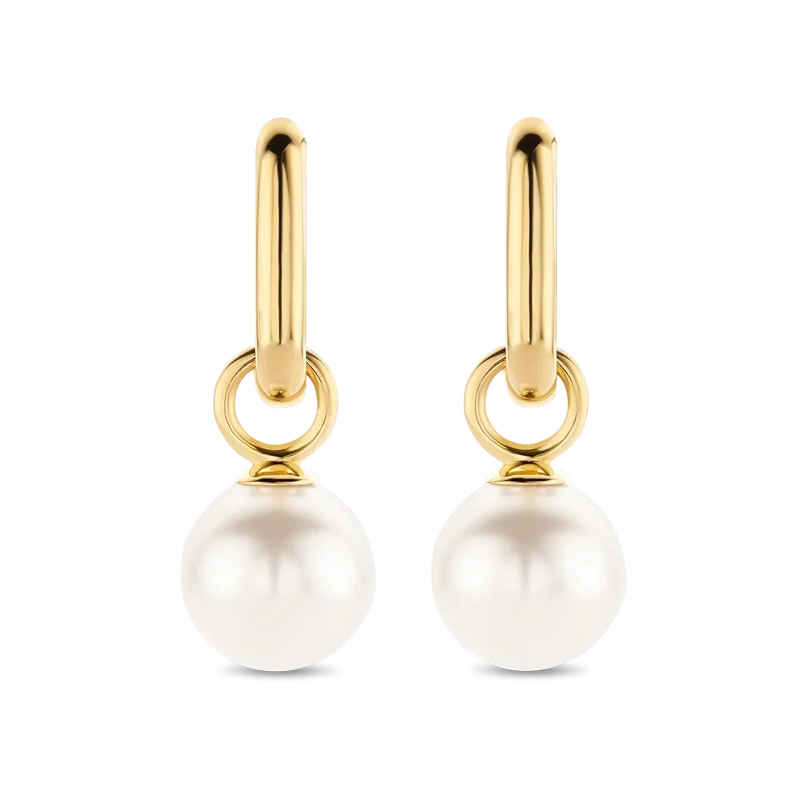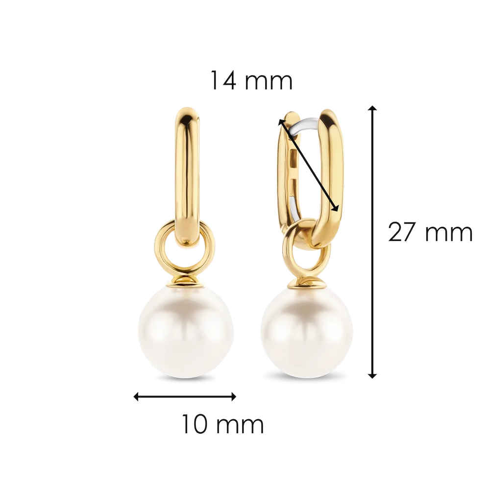 Blend the timeless beauty of pearls with the sleek allure of sterling silver in these drop earrings! Expertly crafted from sterling silver then plated in warm yellow gold, a gorgeous 10mm pearl gently sways beneath each chic hoop. Pearls - the ultimate style boost - bring a dash of classic charm and sophistication to any outfit. Their iridescent glow adds understated luxury, captivating onlookers with timeless elegance.