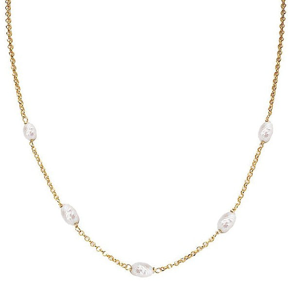 Delicate with a modern twist. Five luminous rice-shaped freshwater pearls are stationed along a gold-plated sterling silver chain, creating a look that’s equal parts classic and on-trend. The adjustable length allows you to style it at just the right spot, whether you’re layering with other necklaces or letting the pearls shine solo. Effortless, versatile, and chic, this piece is a fresh essential for every jewelry collection.