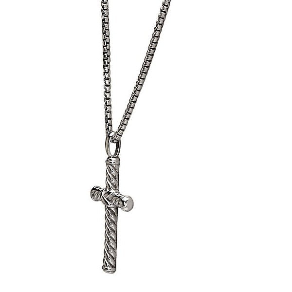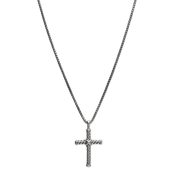 A classic symbol with bold texture. Crafted in solid sterling silver, this cross pendant features a rope-inspired design that adds rugged dimension and timeless style. It hangs from a 22-inch round box chain, offering strength and durability with a clean, modern edge. Meaningful and versatile, it’s a piece that’s easy to wear every day, whether on its own or layered with other chains for a more personalized look.