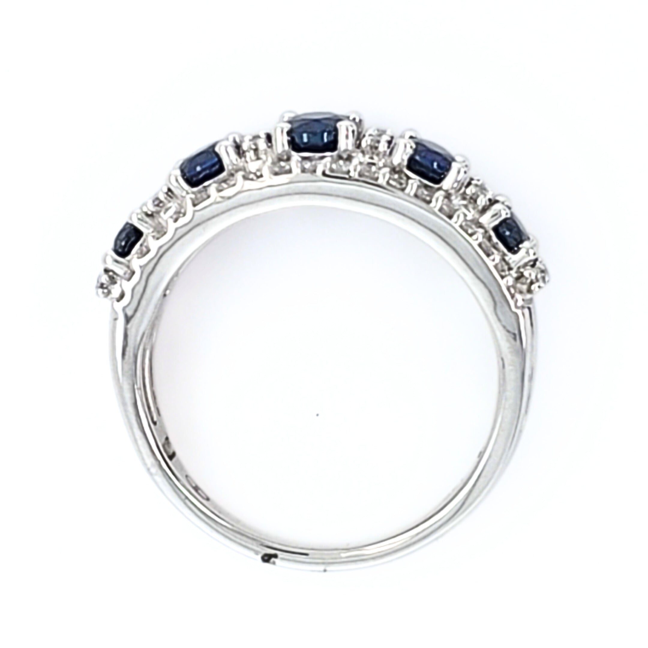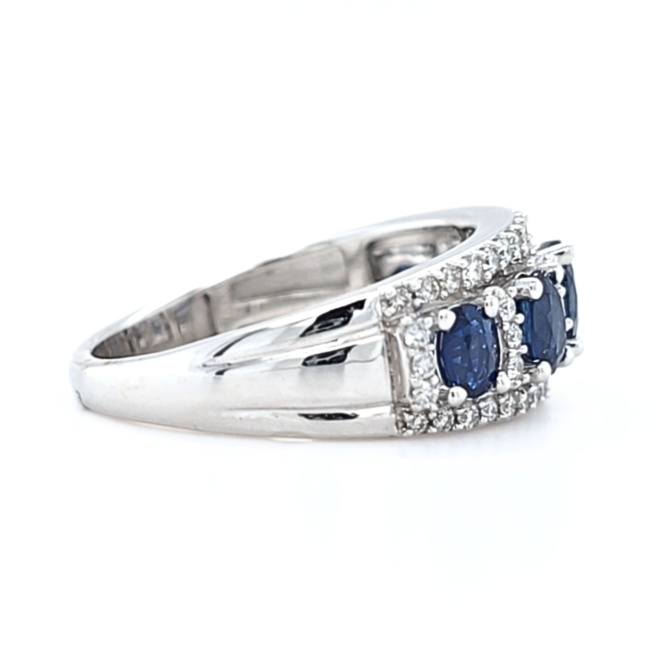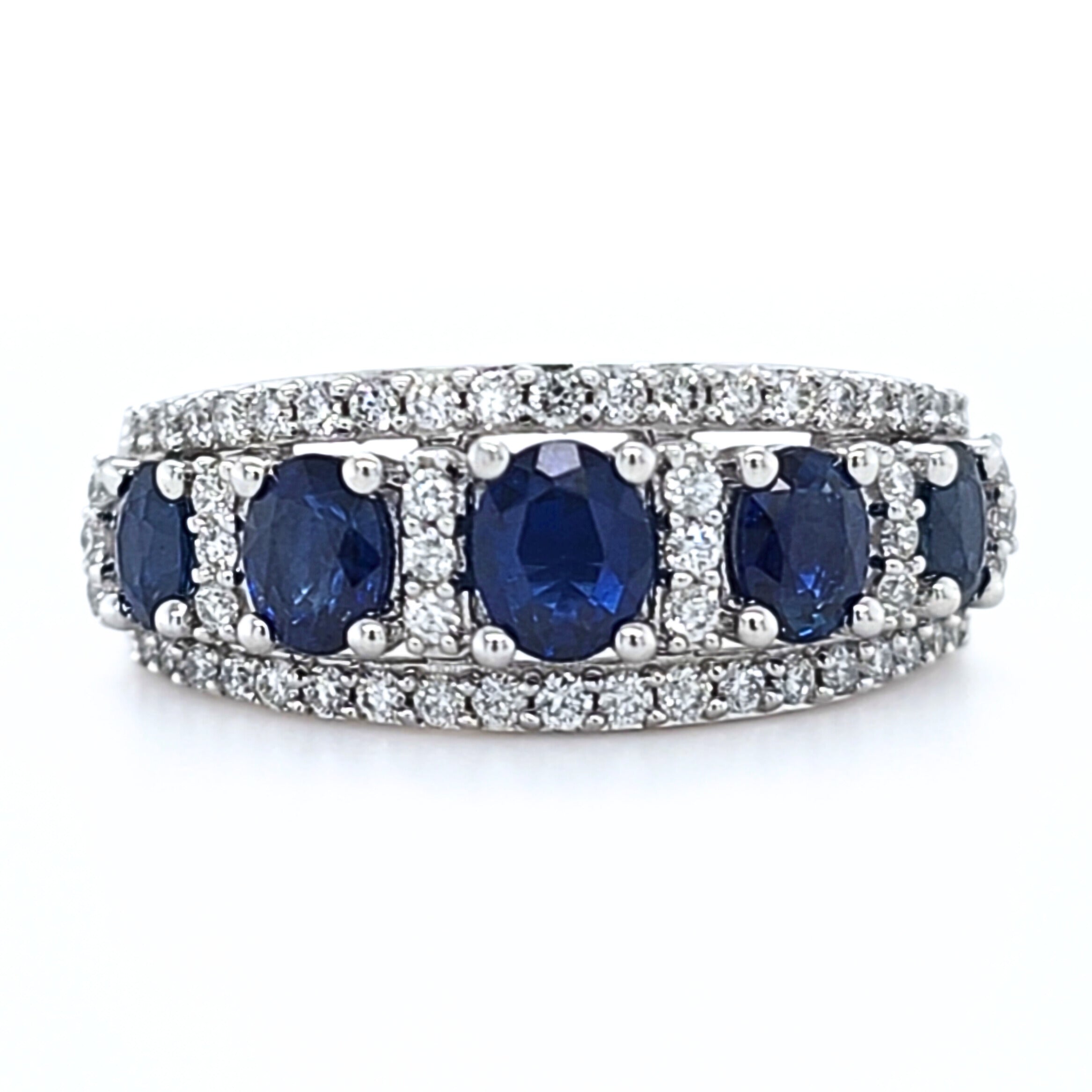 A timeless pairing of rich blue and brilliant white. This breathtaking band showcases oval-cut sapphires framed by sparkling diamond borders, all set in polished white gold. The graduating design adds balance and structure, giving this ring its bold yet refined presence. Whether worn as a statement piece, an anniversary band, or a touch of color in your daily stack, this ring radiates classic elegance with a contemporary edge.