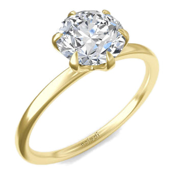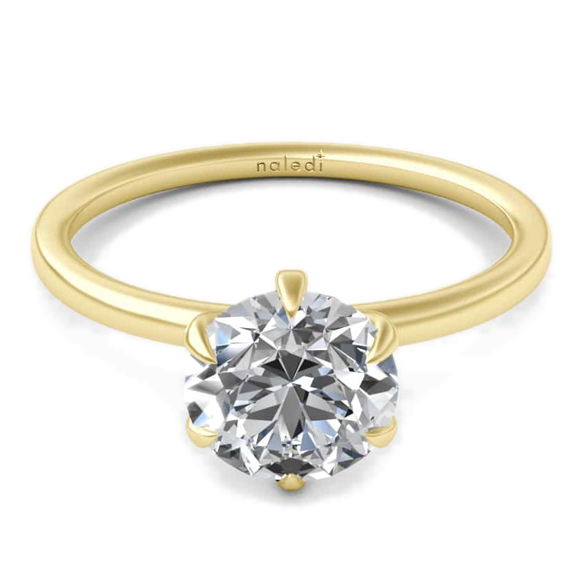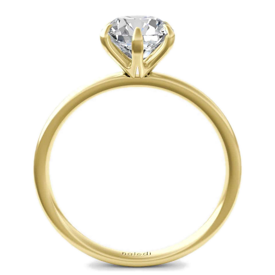 This classic solitaire engagement ring features your round center stone set in six prongs atop a smooth band of polished gold. An elegant and beautiful reminder of your everlasting love. Plus, its shiny polished shank pairs seamlessly with a variety of wedding band styles.