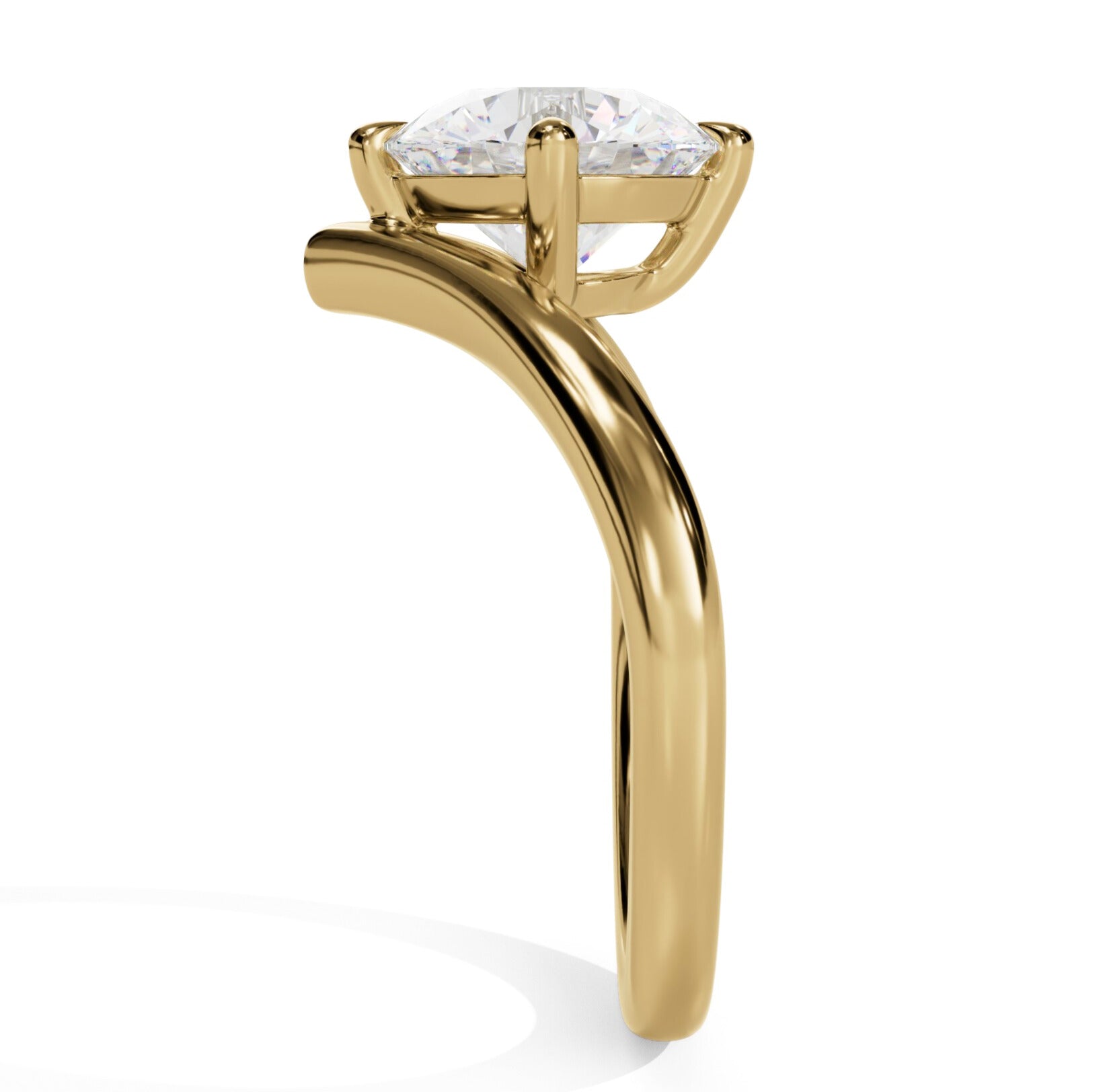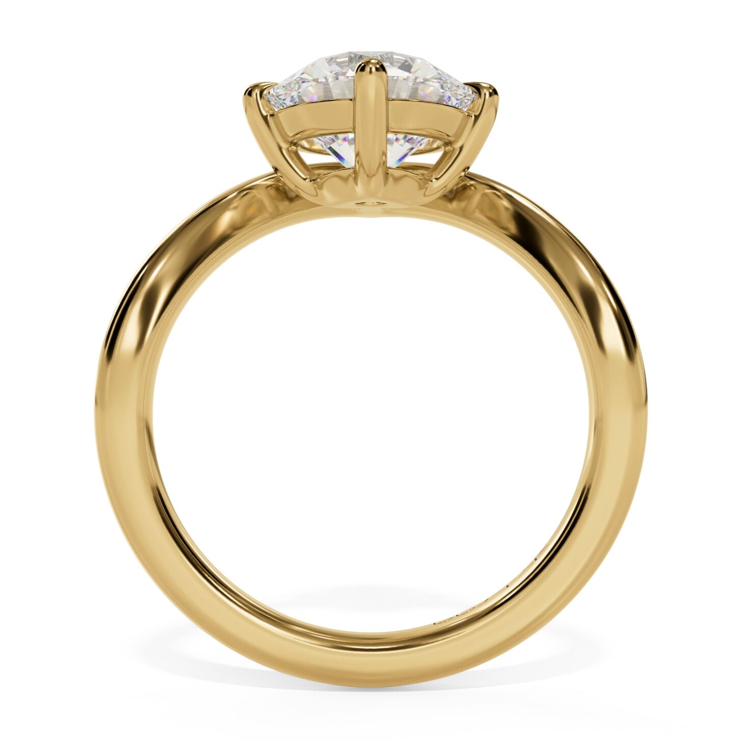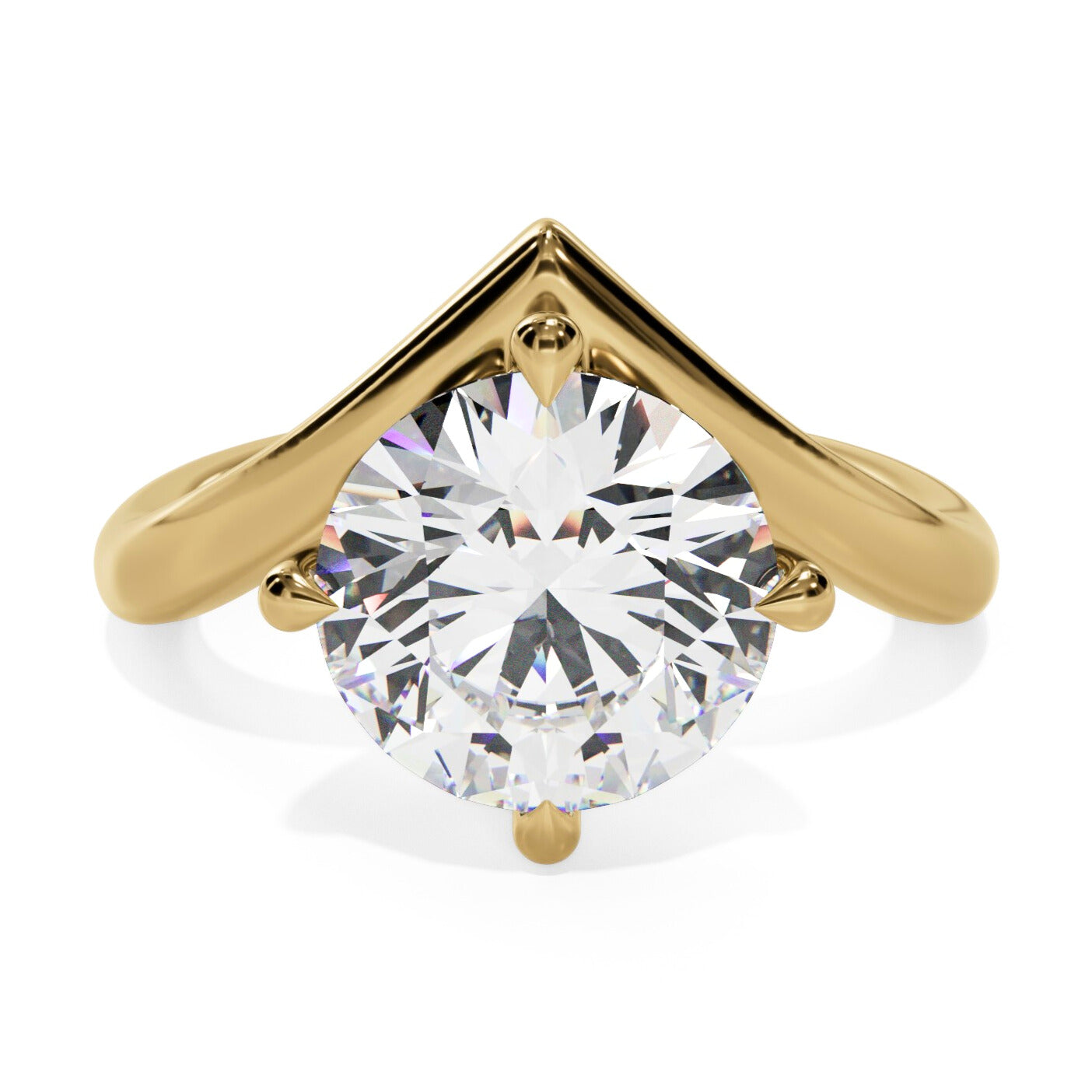 Sculptural and striking, this solitaire engagement ring redefines minimalism. A polished band of yellow gold sweeps into a sharp chevron, drawing the eye to the round center stone and framing it with clean, modern lines. The sleek silhouette gives this classic solitaire a contemporary edge — bold enough to stand alone, yet timeless enough to pair with your favorite wedding band.