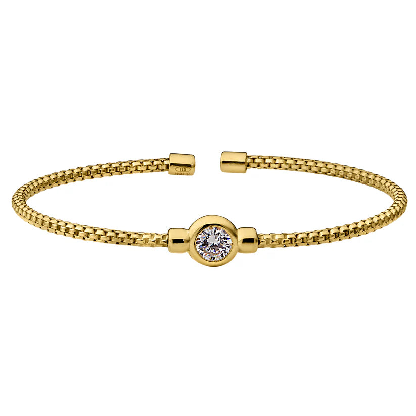 Sleek, modern, and effortlessly wearable. Crafted in gold-plated sterling silver, this open cuff features a rounded box link design that offers both cool texture and an easy, comfortable fit. A smooth bezel holds a cubic zirconia at the center, creating a refined focal point with just the right touch of sparkle. Designed to slip on with ease, this cuff is minimal yet striking — perfect worn solo for a clean, contemporary look or stacked with other bangles for effortless style. Create a personalized stack by mixing it with other birthstone colors for a look that’s uniquely yours!