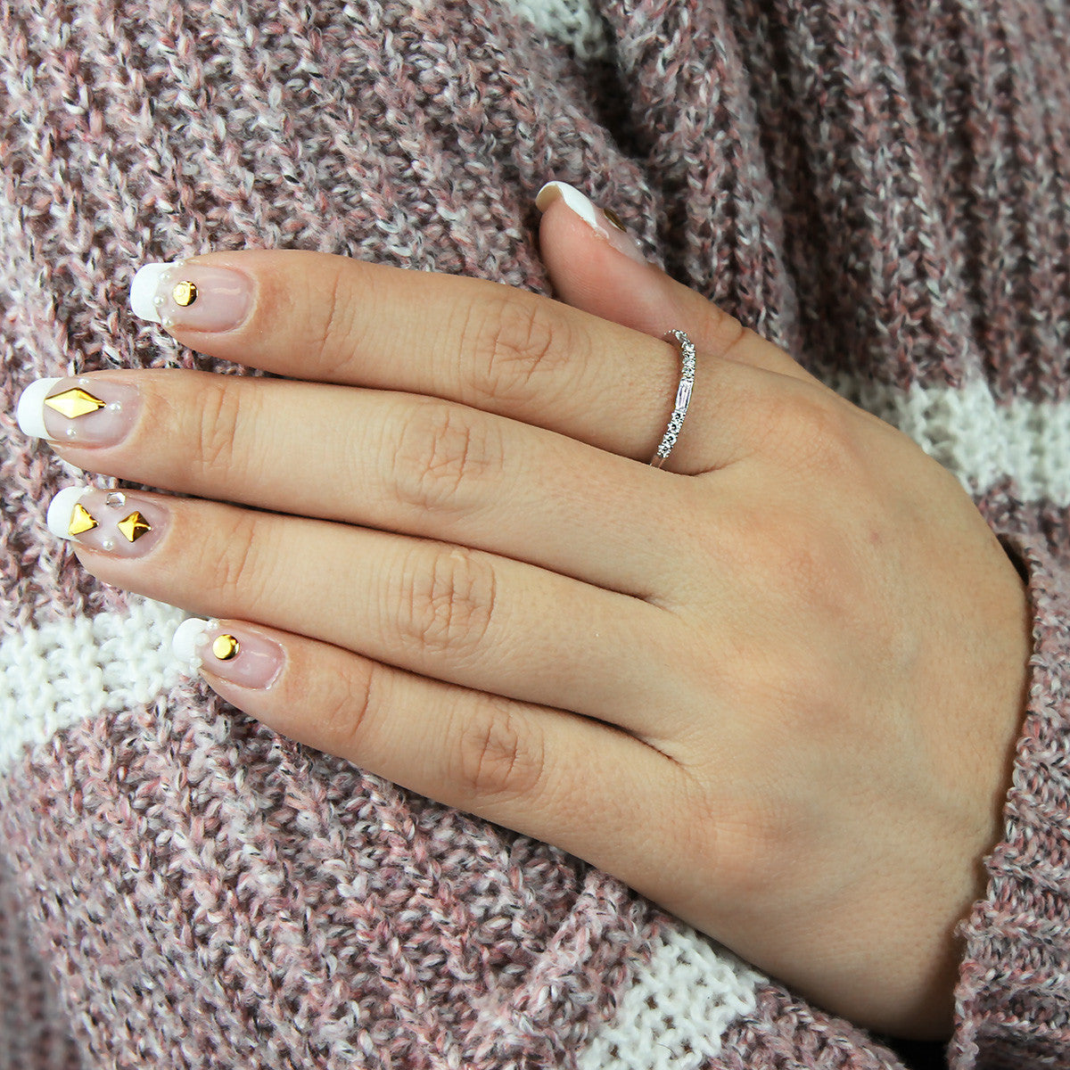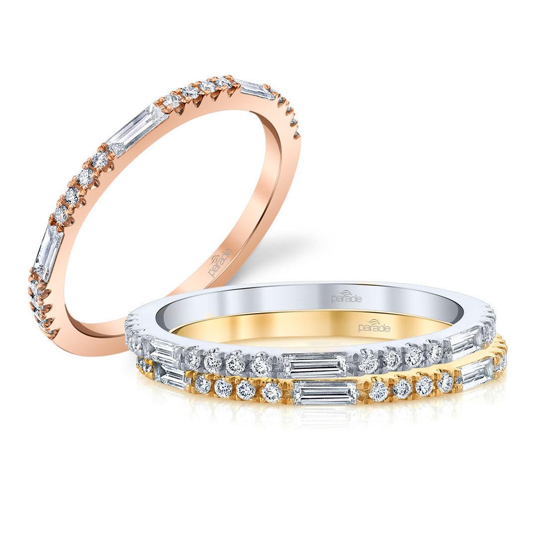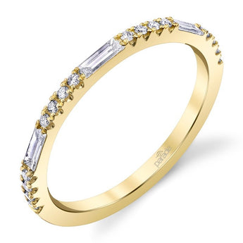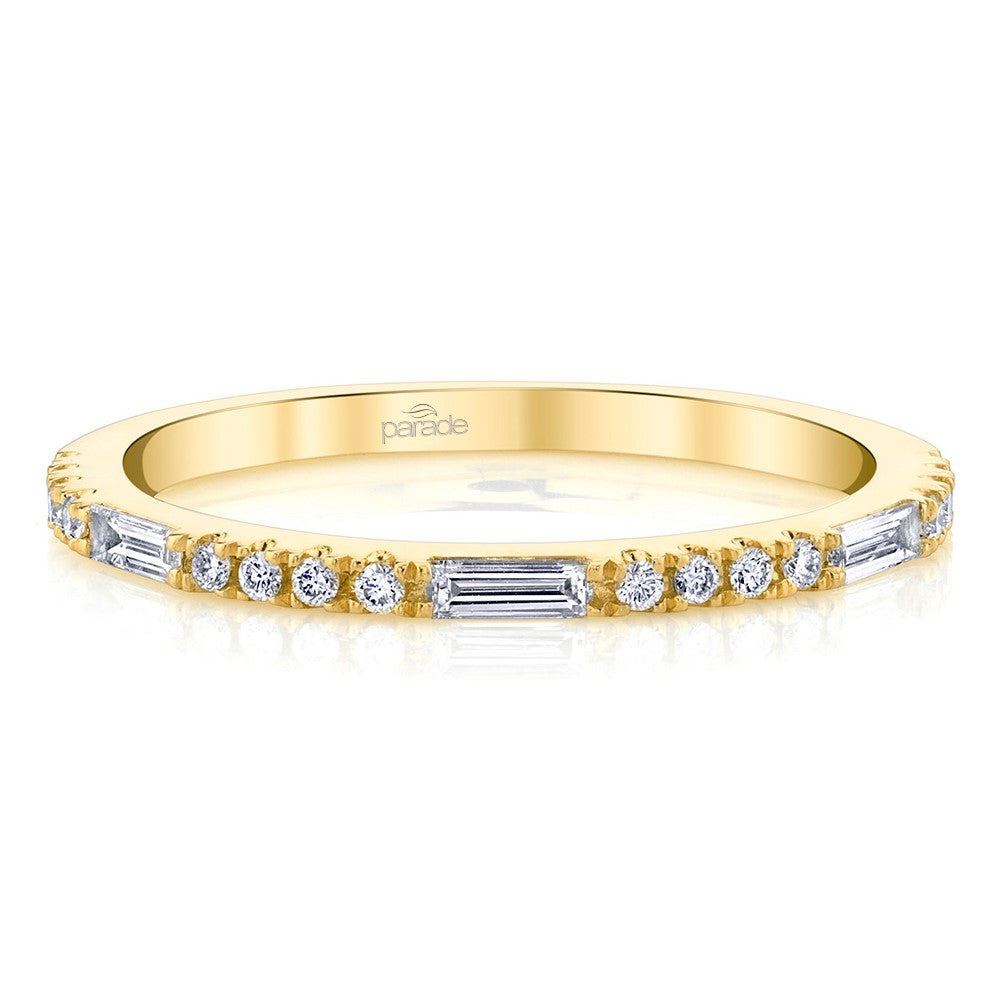 An alluring pattern of brilliant round and straight baguette diamonds adorn a gorgeous band of gleaming gold. Wear this beauty alone or pair with your engagement ring to add some modern flair to your wedding set. You can also swap out the round diamonds for rubies, emeralds, or sapphires to add some color to your ring stack!