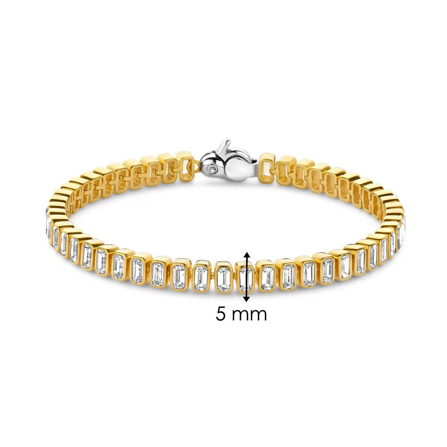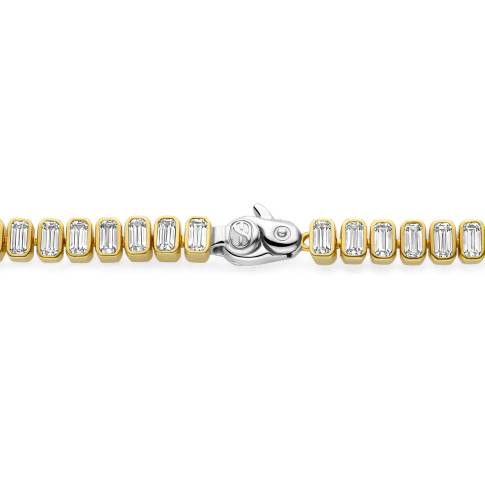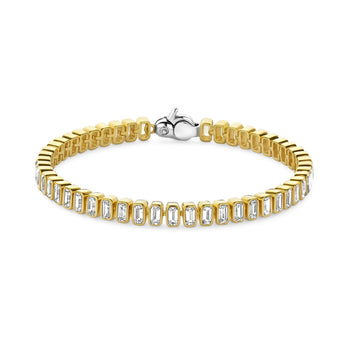 Indulge in timeless luxury with this gold-plated silver tennis bracelet. This exquisite bracelet features a series of emerald-cut white cubic zirconia stones, each meticulously set in yellow gold-plated silver settings. Both modern and classic, its elegant design makes for a versatile piece that effortlessly transitions from day to night. Whether you prefer a minimalist or layered look, this piece adds a harmonious blend of luxury and contemporary style to any ensemble.