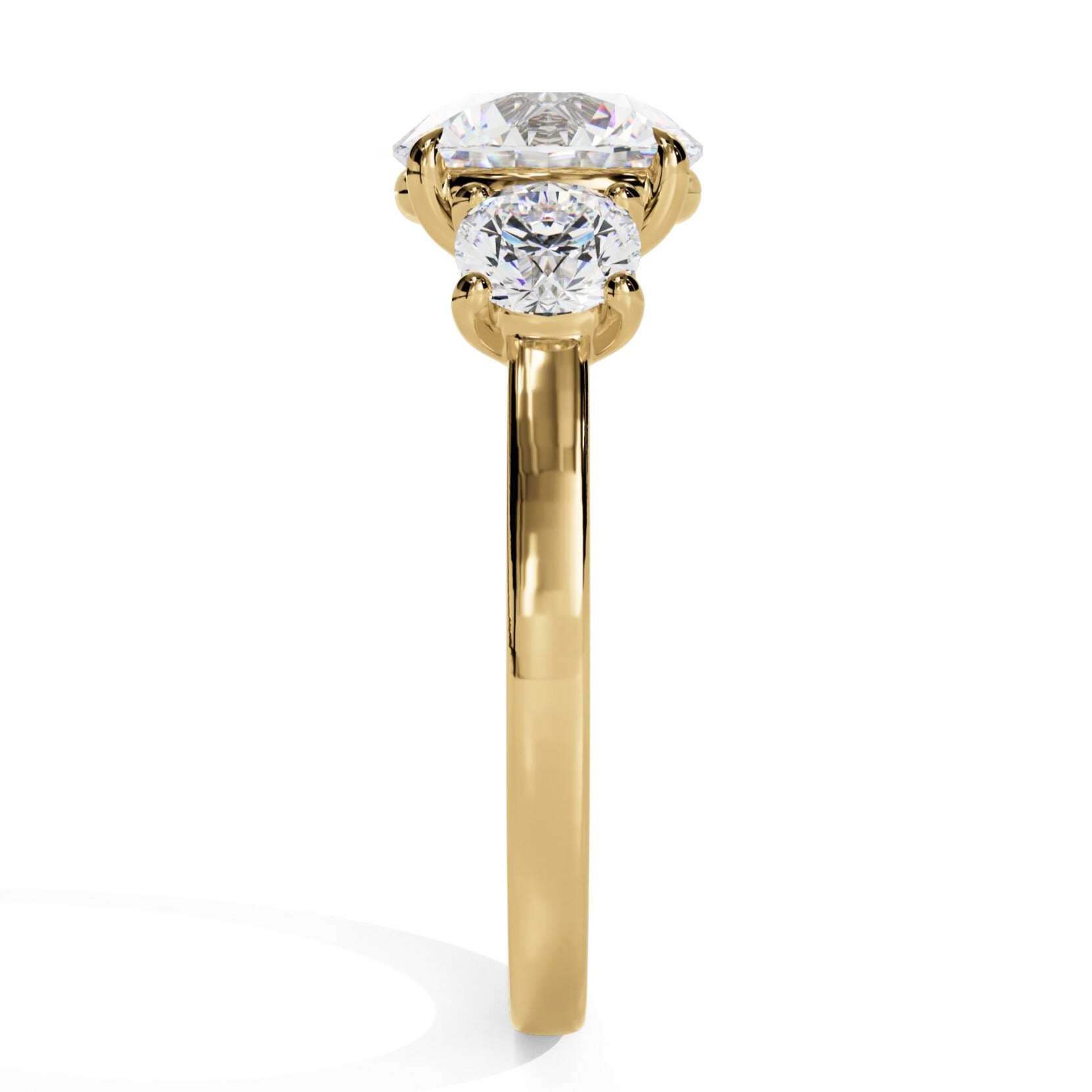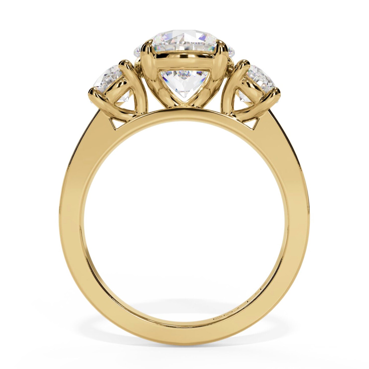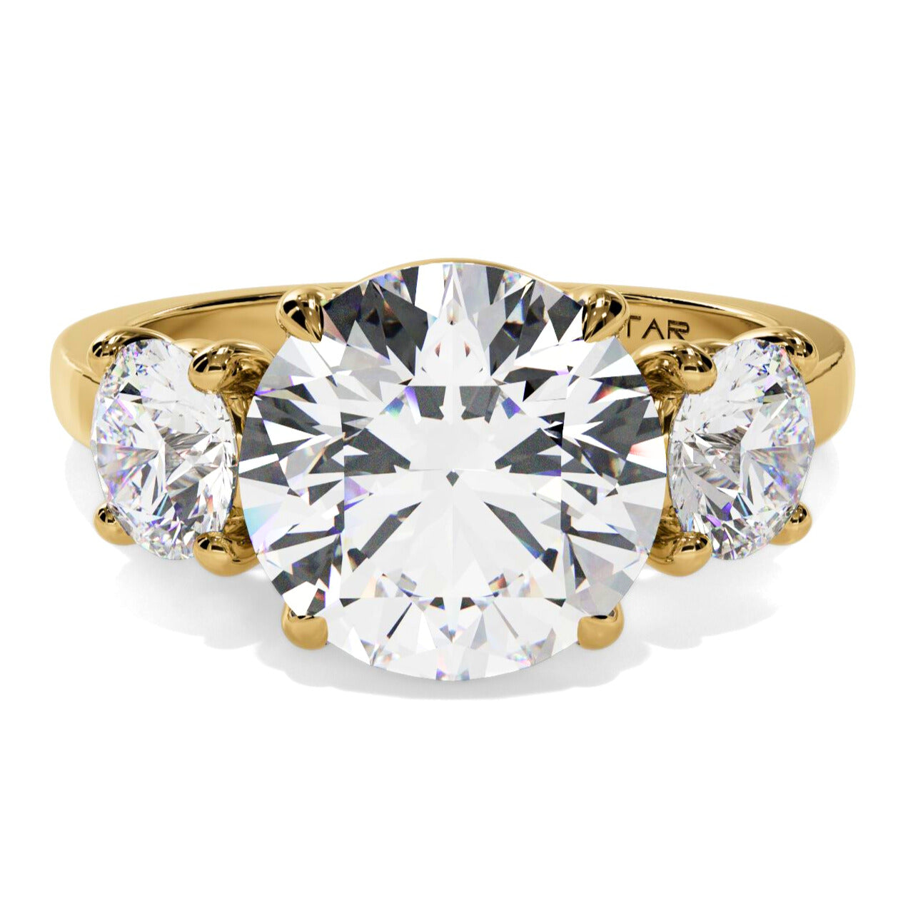 This classic three-stone engagement ring features your stunning round center stone, embraced by two matching round diamonds on either side. The glittering trio sits atop a band of sleek yellow gold for a practical yet elegant look that will never go out of style.