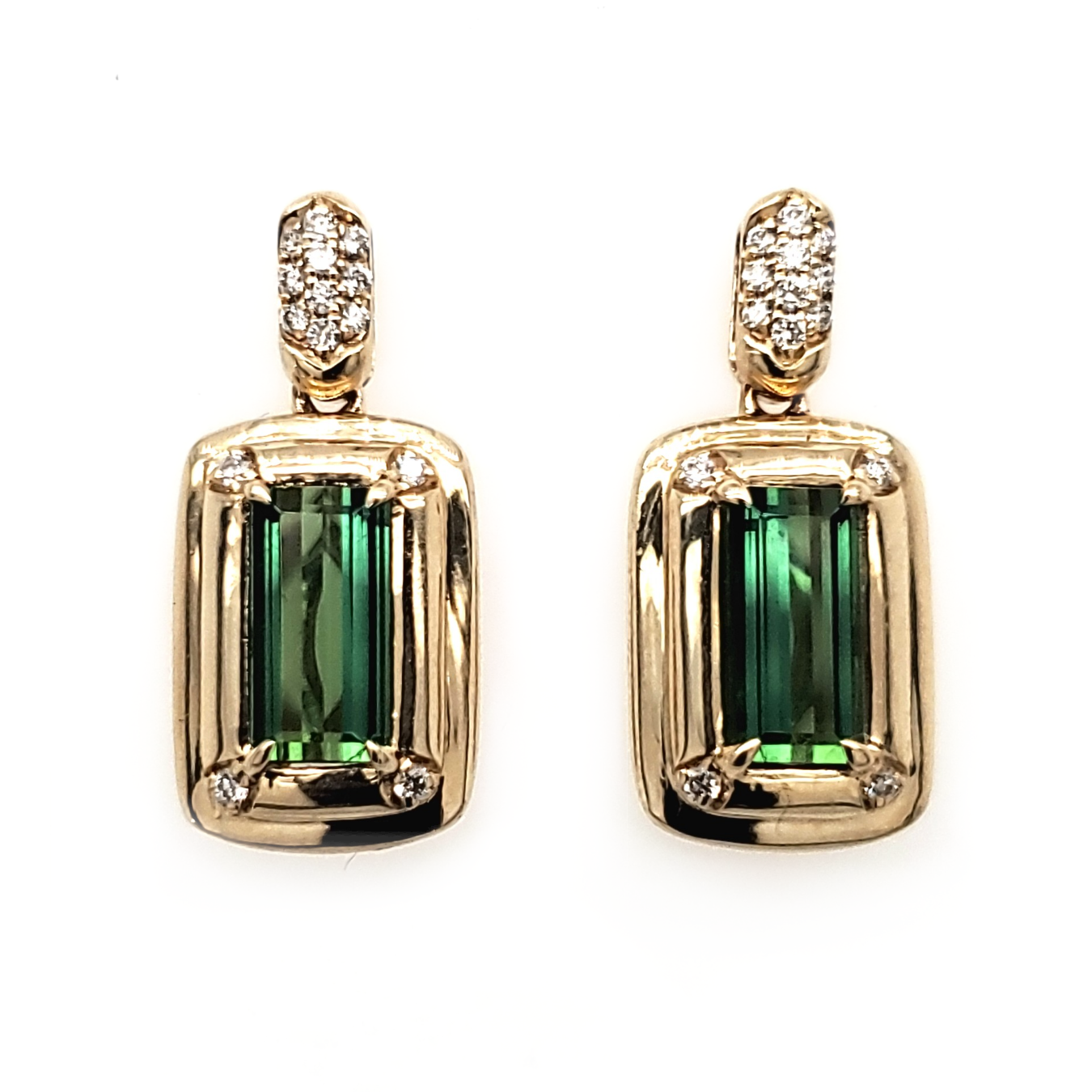Add a pop of luxurious color to your look and bring the wow-factor to any occasion! Vibrant emerald-cut green tourmalines take center stage, surrounded by the radiant glow of yellow gold. At the top, pavé diamond accents add a brilliant finishing touch. These earrings are the perfect accessory to turn heads, whether you're dressing up for a cocktail party or a special night out. Pair them with the matching pendant and ring to create a perfectly coordinated, unforgettable look.