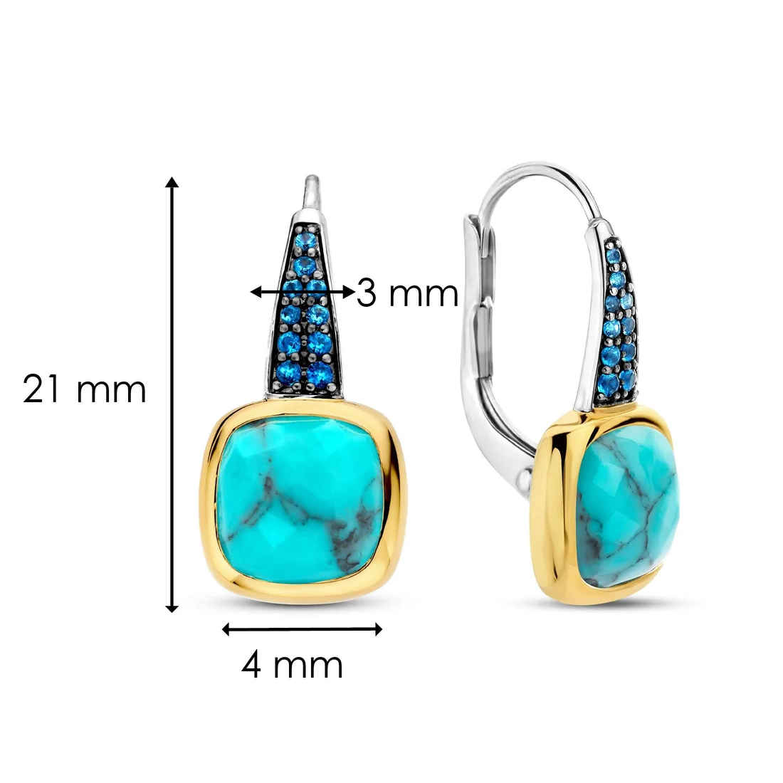 Dazzle with this harmonious blend of sleek geometry and bold colors. Vibrant cushion-shaped turquoise stones lie handset in radiant yellow gold-plated frames. The cushion shapes, symbolizing stability and direction, perfectly showcase iconic design elements. The earrings feature dazzling dark blue zirconia, adding depth and opulent glamour to the design. The fusion of turquoise, dark blue pavé, and yellow gold-plated accents creates a statement piece that not only embodies luxury but also captures the ultimate color of summer.